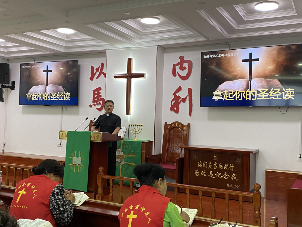 为树立圣经权威,坚定信仰根基,引导信徒珍爱圣经、熟读圣经、背诵圣经、回归圣经,借着神的话归正信仰、提升灵性,提高分辨异端、抵御邪教的能力,2025年9月5日上午,杏花岭区基督教柏杨树堂举行了以“拿起你的圣经读”为主题的圣经日活动,骆合祥牧师主持。